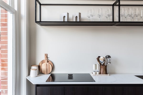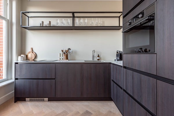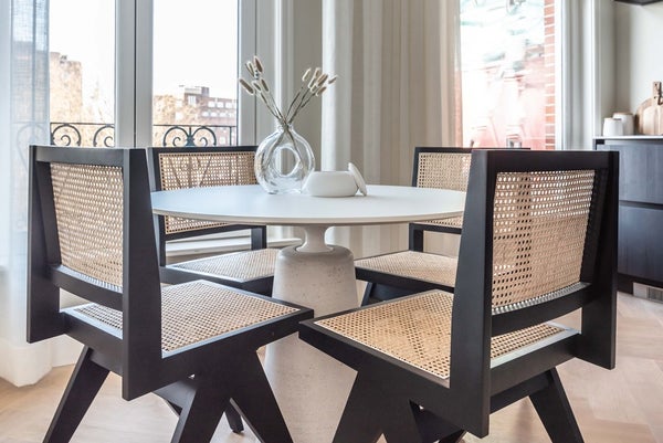 Je vindt ook een mooie eettafel in deze kamer met vier comfortabele stoelen. Naast de tafel bevindt zich de elegante open keuken. Deze bevat alles wat je nodig hebt om je heerlijke diners te bereiden: een magnetron/stoomoven, een quooker, koelkast, vaatwasser, koffiezetapparaat, toaster en voldoende opbergruimte. Alles verborgen achter de stijlvolle zwart matte look.