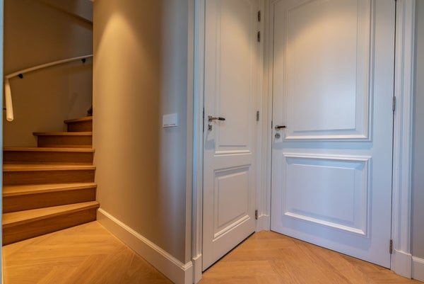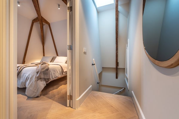 Via de trap bereik je de overloop op de vierde verdieping. Hier vind je de master bedroom, waar je nog de oorspronkelijke houten balken kunt zien die je herinneren aan het historische karakter van dit appartement. Hier heb je een comfortabel tweepersoonsbed waar je goed kunt slapen of gewoon even kunt ontspannen. De ingebouwde kast bevat voldoende opbergruimte voor je garderobe. Een stevige bureau met een comfortabele bureaustoel zorgt ervoor dat dit ook een ideale werkplek is om thuis te werken.