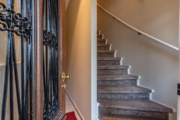 Bij binnenkomst in de afgesloten trapgang op straatniveau voel je al de geschiedenis van dit gebouw, gelegen op een steenworp afstand van het Vondelpark en het Leidseplein. Op de derde verdieping betreed je appartement E. Zodra je de hal van het appartement binnenstapt, voel je onmiddellijk dat dit een plek kan zijn om je thuis te voelen. De gang geeft toegang tot de woonkamer, een apart toilet met fontein, versierd met marmer, en de trap naar de vierde verdieping.