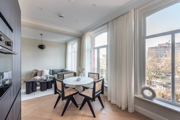 Vanuit de gang kom je in de woonkamer, die aan de voorzijde van het appartement is gelegen. Het is een lichte en open ruimte met drie grote ramen die uitzicht bieden op de weelderige groene Singelgracht. Zittend op de comfortabele bank hier, wil je deze rustgevende kamer misschien nooit meer verlaten. Of je nu een film kijkt op de tv of geniet van een drankje met vrienden, deze kamer voelt als een knus thuis midden in het centrum van Amsterdam.