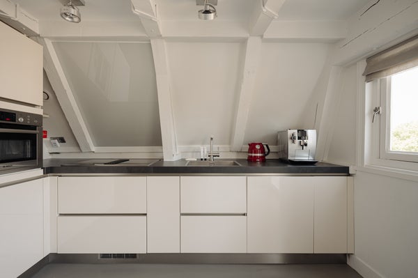 De sfeervolle woonkamer ligt aan de grachtzijde, de grote raampartijen zorgen voor een prettige lichtinval en uitzicht over de Prinsengracht. De open keuken is uitgerust met inbouwapparatuur en een geïntegreerde wasmachine. De ruimte is stijlvol ingericht en biedt veel praktische opbergruimte. Daarbij draagt een zichtbaar houten balkenplafond in de gehele woning bij aan een authentieke en charmante uitstraling.