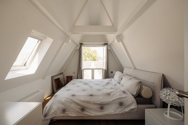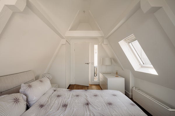 Via de trap in de hal zijn de twee goed bemeten slaapkamers bereikbaar. De moderne badkamer beschikt over een ligbad, inloopdouche en wastafel en toilet. Vanuit deze verdieping is er toegang tot het royale dakterras: een heerlijke buitenruimte met volledige privacy en zonlicht gedurende de hele dag.