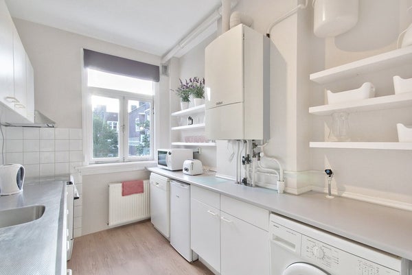 De woonkamer is gelegen over de volle lengte van de woning, daardoor is er een ruime zitkamer en eetkamer. Deze kamer is voorzien van 2 originele schouwen en heeft een PVC houten vloer. Aan de achterzijde komt met via openslaande deuren op het balkon, dat is gelegen op het oosten. Badkamer is voorzien van een ligbad met douche, handdoek radiator en wastafel. Verder bevindt zich in de hal een separaat toilet. De gezellige keuken is gelegen aan de achterkant van het appartement, en is voorzien van een fornuis, vaatwasser, koelkast, magnetron en ook de wasmachine. Verder is er in de woning Internet en kabelaansluiting aanwezig.
