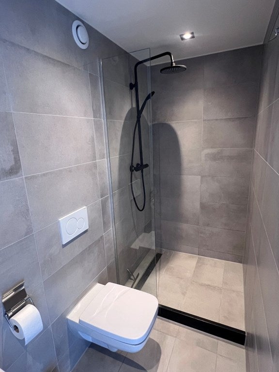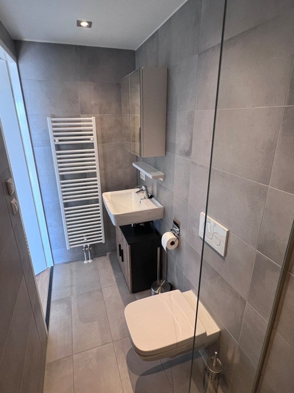 De volledig betegelde luxe badkamer is voorzien van een inloop regendouche, wastafel met planken eronder, medicijnkast, designradiator en 02de toilet.
