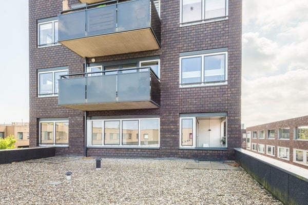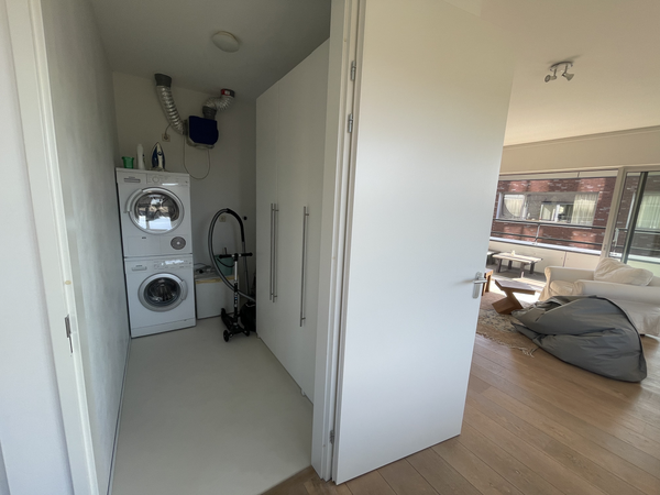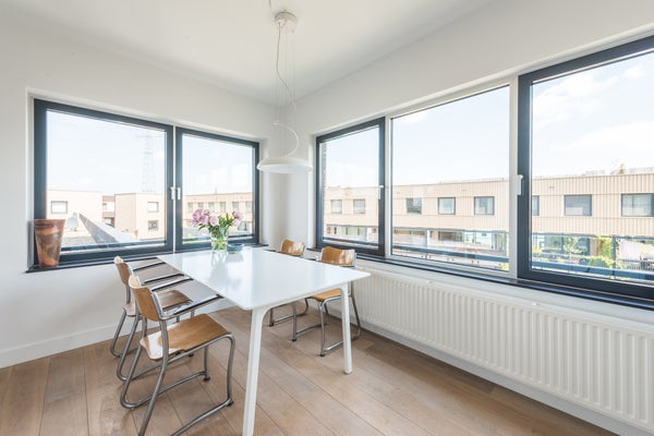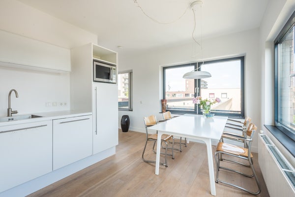 De ruime woonkamer heeft rondom grote ramen, waardoor de ruimte heerlijk licht is en mooi uitzicht geeft. Vanuit de woonkamer heb je via een glazen schuifpui toegang tot een heerlijk overdekt balkon. Aan de woonkamer grenst de half open moderne keuken, welke van alle gemakken voorzien is, met het eetgedeelte.