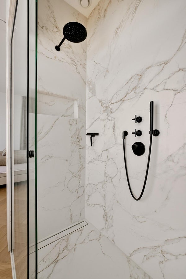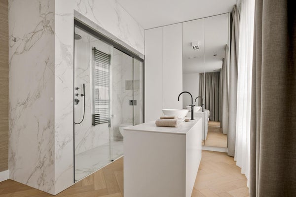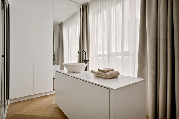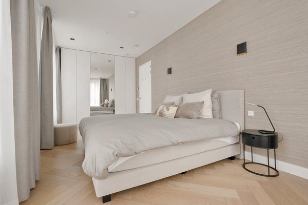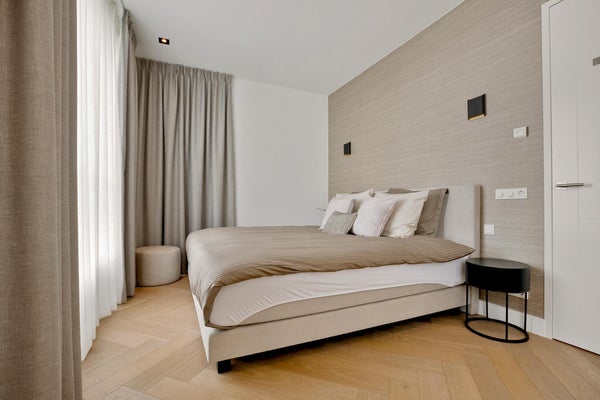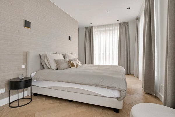 De master bedroom, bereikbaar via de hal, beschikt over een walk-in closet en een ensuite badkamer/wc met hoogwaardige materialen. De overige twee slaapkamers zijn goed bemeten, waarvan één met een aangrenzend terras. Aan de overzijde van de slaapkamers bevindt zich een tweede badkamer met inloopdouche en een ruime wastafel. Ook is er een wasruimte met wasmachine en droger van Miele, en veel opbergruimte.