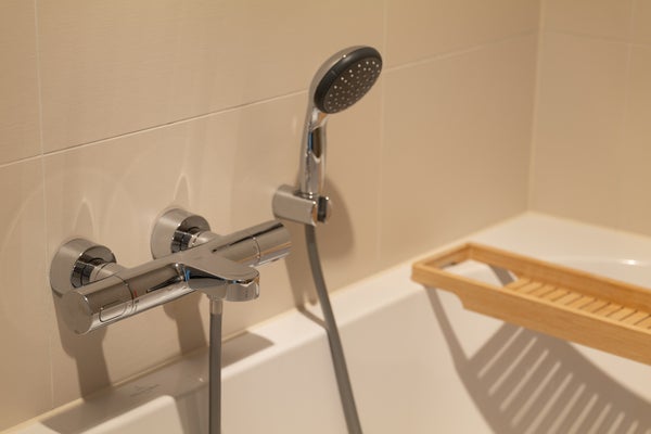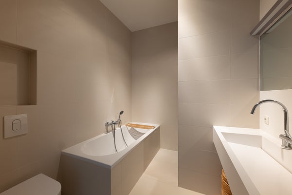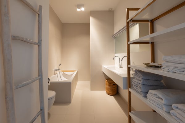 - Badkamer met inloopdouche, separaat bad, dubbele wastafel en toilet;