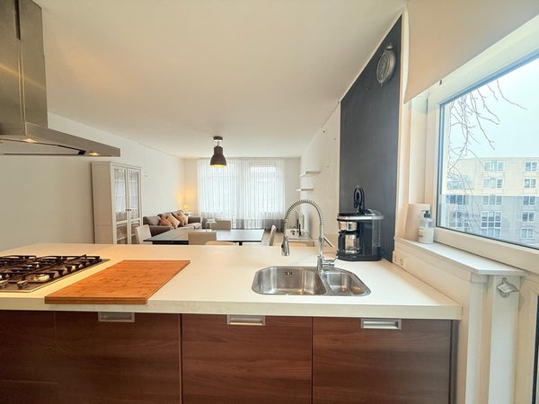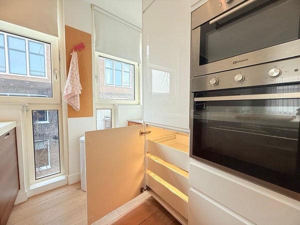 Vanuit het appartement kun je genieten van een prachtig uitzicht over het kanaal, met klassieke huizenboten, historische gevels en het rustige ritme van het Amsterdamse leven dat voorbijglijdt. Grote ramen laten veel natuurlijk licht binnen, waardoor de ruimte helder, luchtig en verwelkomend aanvoelt.