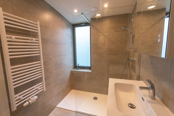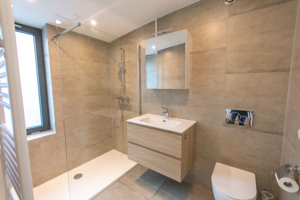 De luxe badkamer, toegankelijk vanuit zowel de keuken als de slaapkamer, is voorzien van een inloopdouche, wastafel en toilet.