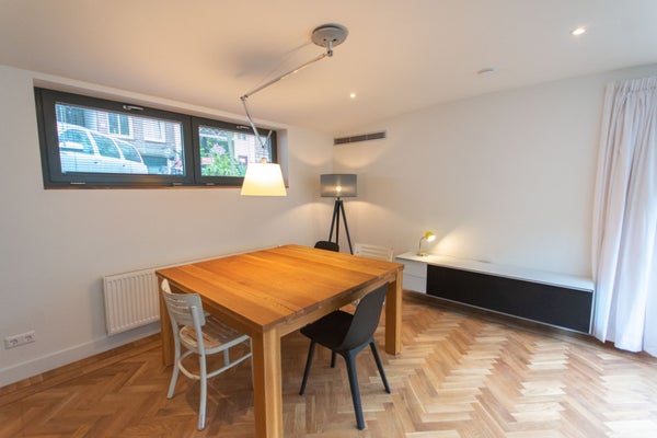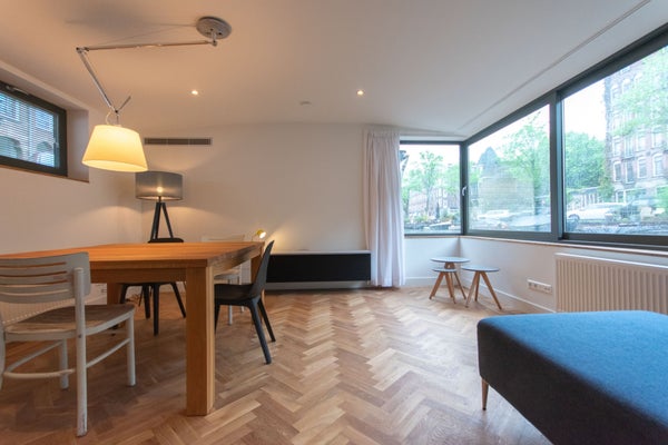 De woonkamer biedt een prachtig panoramisch uitzicht over het kanaal. Er is voldoende ruimte om te dineren, te werken aan de grote tafel of te ontspannen op de comfortabele bank. Er is ook een tv beschikbaar.