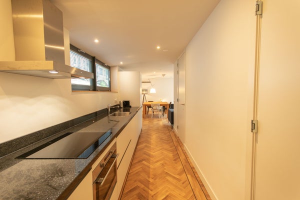 Het appartement opent naar een lange, volledig uitgeruste keuken met: Inductiekookplaat, Afzuigkap, Oven met magnetronfunctie, Vaatwasser, Koelkast en aparte vriezer.