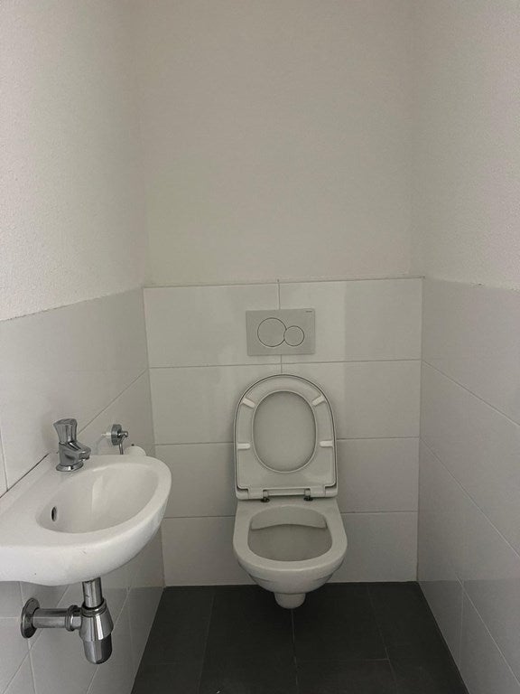 De badkamer heeft een wastafel, wastafelmeubel, toilet en douche.