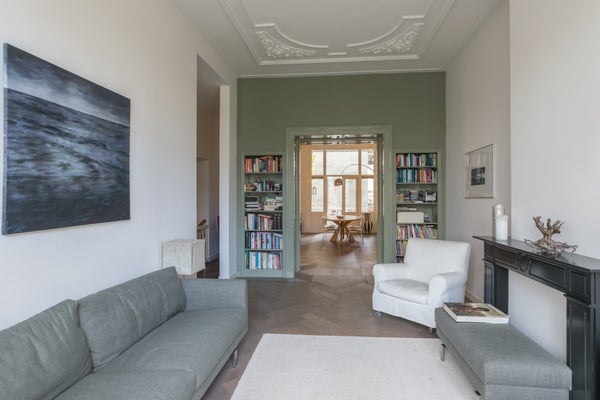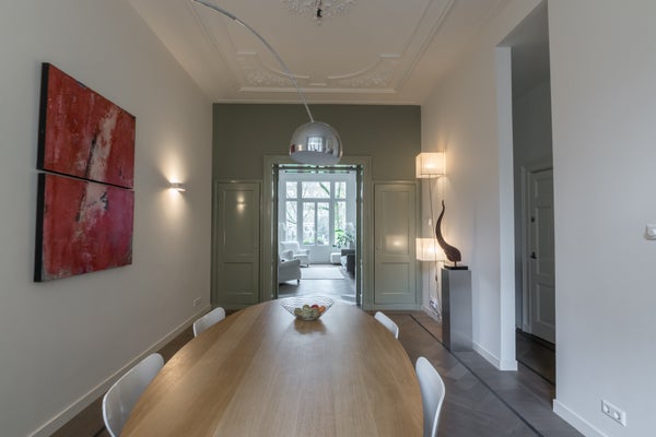 Er ligt een prachtige houten visgraatvloer door het hele appartement.