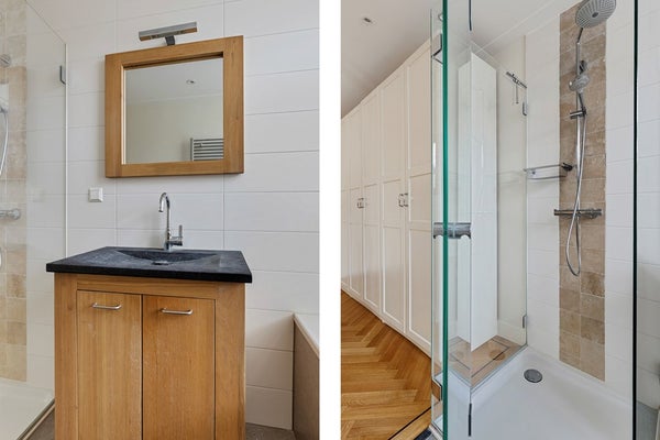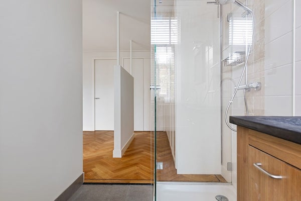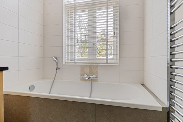 Vanuit de woonkamer is er toegang tot het toilet, washok en de slaapkamer. De ruime slaapkamer bevind zich aan de achterzijde en heeft een aparte 'walk in closet' green aan de badkamer 'ensuite' voorzien van een ruime inloopdouche, wastafel en ligbad.