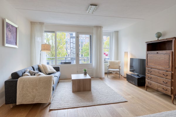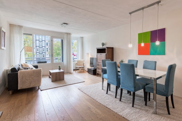 Indeling: Afgesloten toegang met intercom, trap of lift naar de eerste verdieping, aan einde van een verbrede galerij (met uitzicht op de binnentuin) de entree van de woning. Hal met separaat toilet en toegang tot alle vertrekken van het appartement. Vanuit de ruime woonkamer heeft u een zitgedeelte met toegang tot het zonnige balkon aan de grachtzijde met een prachtig uitzicht op het water van de Jacob van Lennepkade. Aansluitend treft u het eetgedeelte en de moderne keuken die is voorzien van alle gewenste inbouwapparatuur en keuken uitrusting. De riante slaapkamer is aan de tuinzijde gelegen. De tweede kleinere is nu in gebruik als studeerkamer. De moderne badkamer is voorzien van een douche, dubbele wastafel en een wasmachine en -droger. In de onderbouw bevindt zich de gemeenschappelijke overdekte fietsenstalling en uw eigen berging.