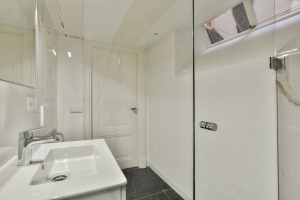 Ruime slaapkamer (ca 23 m²) met hoog raam en uitzicht op patio. Vanuit de slaapkamer is middels een trap naar het souterrain de badkamer te bereiken. De badkamer is voorzien van luxe tegelwerk een inloopdouche, wastafelmeubel en toilet.