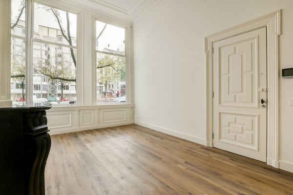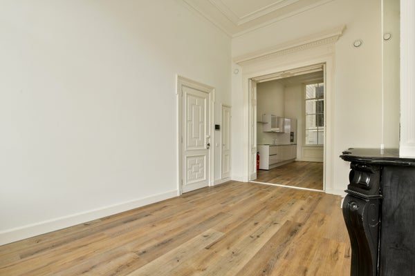 De woonkamer, met veel lichtinval en uitzicht over het Singel, heeft een schouw met spiegel welke is afgewerkt met prachtig sierstucwerk. Middels de ‘en-suite’ deuren kunnen de ruime eetkamer met luxe keuken en woonkamer eenvoudig van elkaar worden afgescheiden. De keuken is voorzien van onder andere een vaatwasmachine, koel-/vriescombinatie en Bora inductieplaat met ingebouwde afzuiging. Het hoge raam in de eetkamer geeft uitzicht op een patio welke voor alle bewoners van het pand toegankelijk is. Zowel de woonkamer als eetkamer hebben een indrukwekkende plafondhoogte van ruim 4 meter. Separaat toilet met fonteintje.