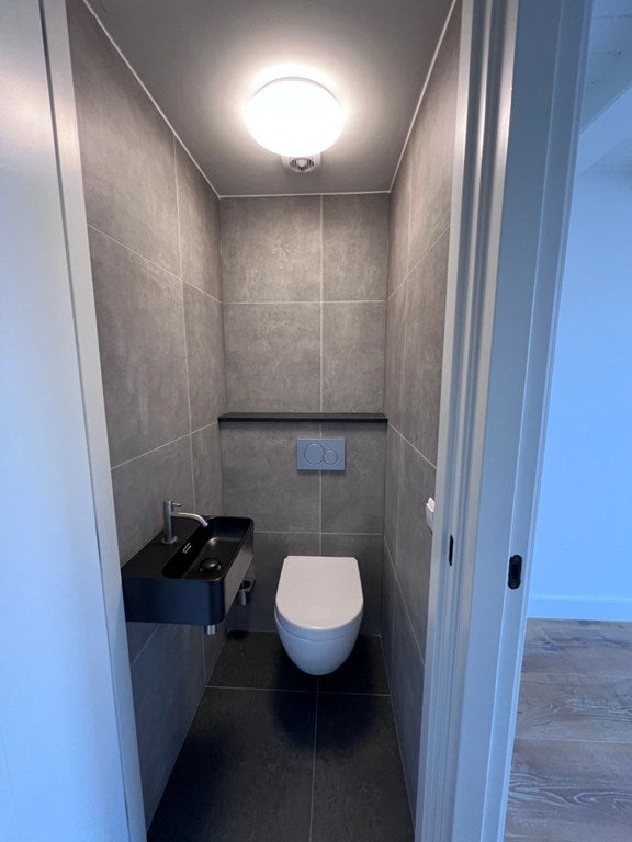 De luxe, volledig betegelde badkamer is ruim en voorzien van een groot ligbad, een inloopdouche met dubbele regendouches en een dubbele wastafel met opbergladen. Een aparte kast huisvest zowel de wasmachine als de droger.