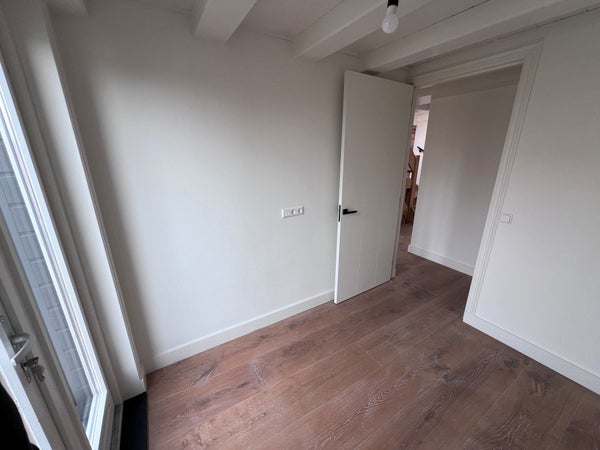 De ruime en lichte woon- en eetkamer beschikt over zichtbare houten balken en brede houten vloerdelen, die warmte en karakter toevoegen. Een gastentoilet bevindt zich aan de achterkant van dit niveau. Een open trap in de woonkamer leidt naar de bovenverdieping.