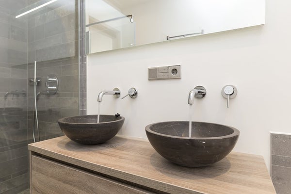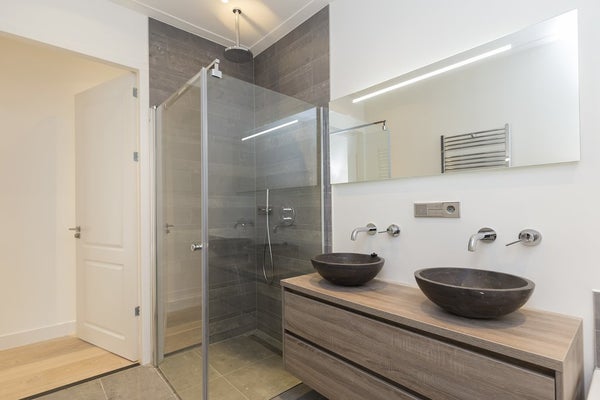 De moderne badkamer omvat een bad, inloopdouche en dubbele wastafel. De tweede slaapkamer of studeerkamer is gelegen aan de voorkant van het appartement.
