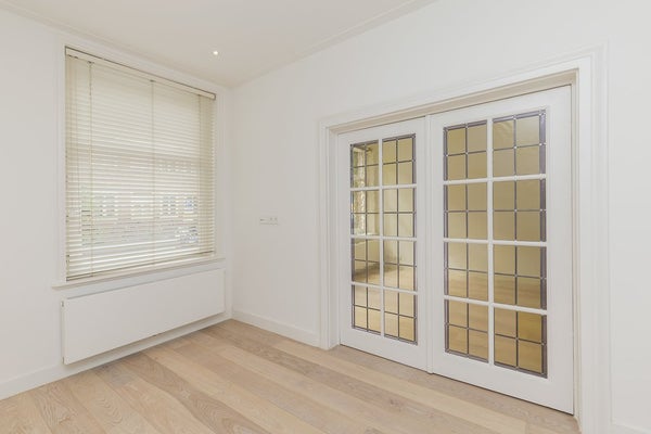 Via de gemeenschappelijke hal kom je het appartement binnen. Mooi parketvloer door het hele appartement. Het hele appartement is voorzien van een houten parketvloer. De hal leidt naar een gastentoilet en een wasruimte. Aan de voorkant is er een ruime eetkamer met originele glas-in-lood deuren (gesloten) en een open keuken die volledig is uitgerust met alle noodzakelijke apparaten. Stalen glazen deuren scheiden de woon- en eetruimtes. De woonkamer biedt toegang tot de tuin aan de achterzijde. De master slaapkamer, gelegen aan de achterkant, heeft ook toegang tot de tuin.