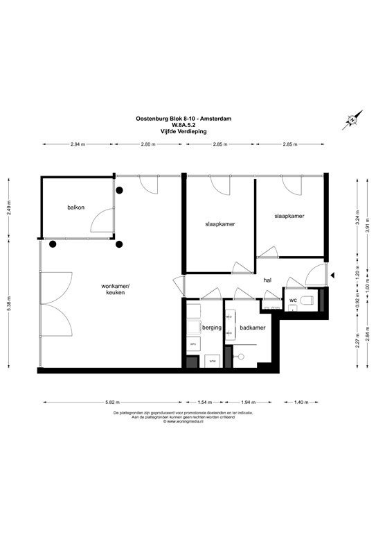 De vijfde verdieping is te bereiken via de gemeenschappelijke lift en trappenhuis. Entree, hal die toegang geeft tot de wc, badkamer, twee slaapkamers en de woonkamer. De woonkamer met open keuken en balkon geniet van een prachtige lichtinval door de grote glazenschuifpui. De keuken is voorzien van alle hedendaagse gemakken. In de benedenbouw is er een ruime fietsenstalling. Parkeerplaatsen in beveiligde parkeergarage op aanvraag.