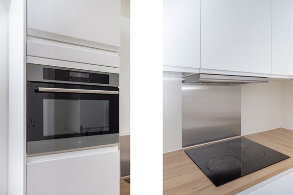 Moderne open keuken welke is voorzien van een magnetron, vaatwasser, combi oven, koelvries combi en een 4 pits inductie kookplaat.