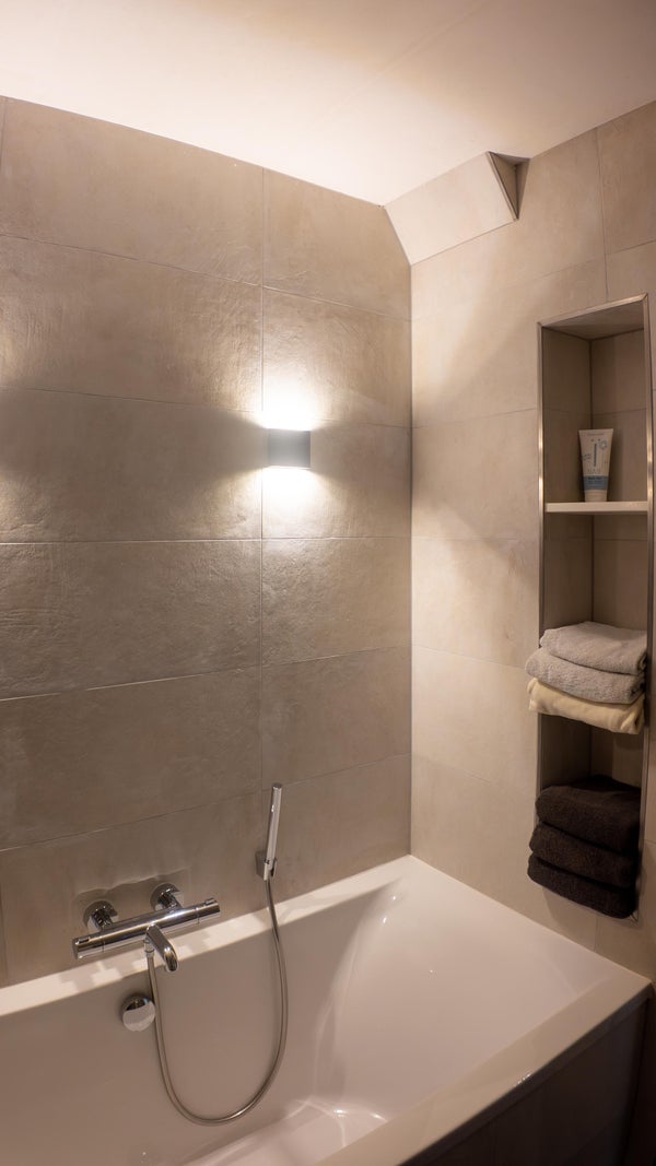 - Moderne badkamer met een groot bad, inloopdouche, wastafel met opbergruimte en hedendaagse afwerkingen;