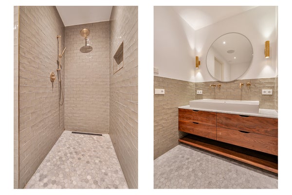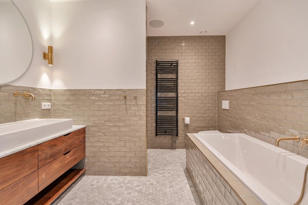 De tweede slaapkamer is flexibel ingedeeld in een gastenverblijf en een kinderkamer, van elkaar gescheiden door een muur met hooggeplaatst raam. Aangrenzend ligt de tweede luxe badkamer met inloopdouche, wastafelmeubel en designradiator.