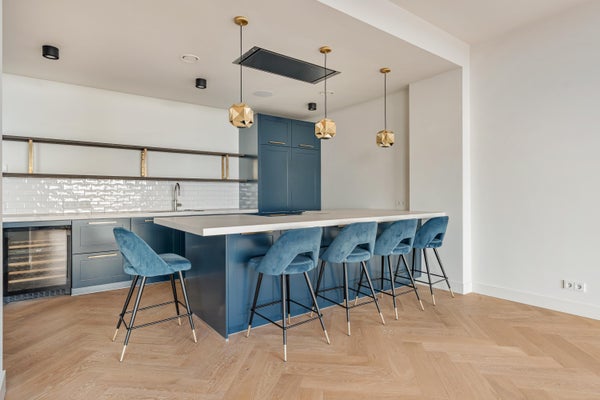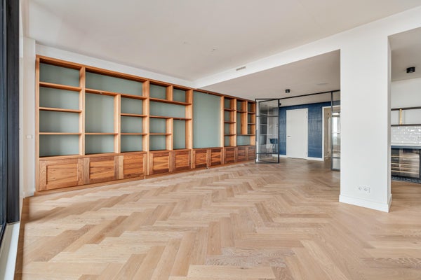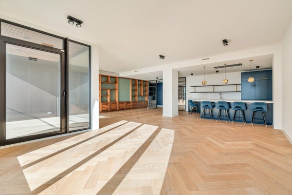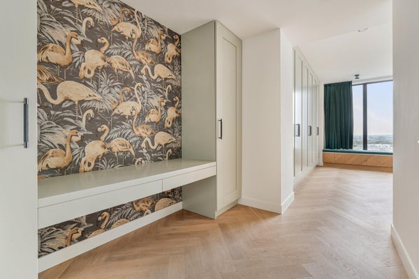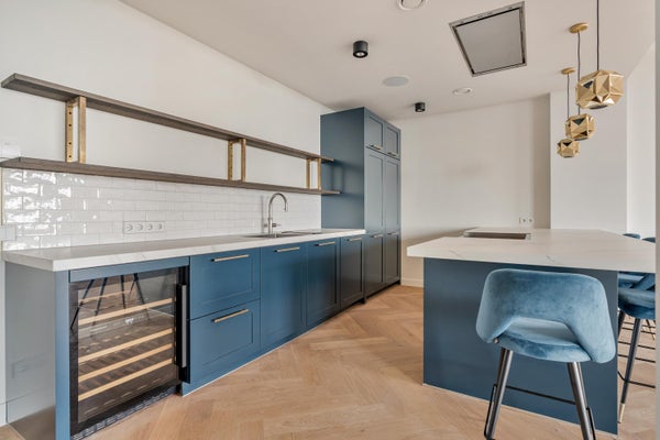 De royale woonkamer is een zee van licht, met weids uitzicht over stad en water. Aansluitend ligt de luxe woonkeuken met kookeiland en hoogwaardige inbouwapparatuur: een Quooker, combi-stoomoven, wijnklimaatkast, grote koel- en vrieskasten, een inductiekookplaat met geïntegreerd afzuigsysteem en vaatwasser – een droom voor de culinaire liefhebber.