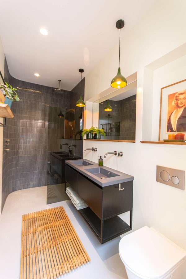 Verwen jezelf in de luxe badkamer die hotelachtige kenmerken heeft, versierd met prachtige tegels. Het beschikt over een dubbele wastafel, een regendouche en een handig geplaatste wc.