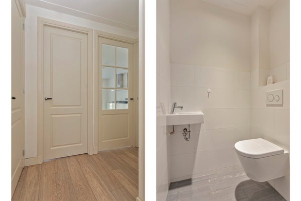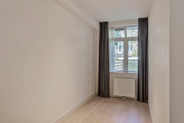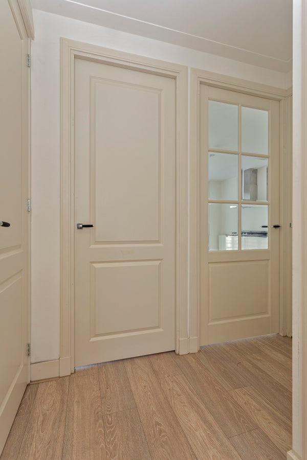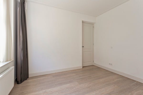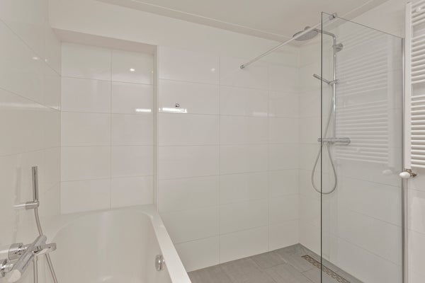 Het appartement beschikt over twee slaapkamers: een ruime slaapkamer aan de voorzijde en een kleinere slaapkamer aan de achterzijde, die ook goed dienst kan doen als werkkamer of logeerkamer. De moderne badkamer is uitgerust met een ligbad, inloopdouche en dubbele wastafel met meubel. Verder is er een separaat toilet aanwezig, evenals een praktische berging met wasmachineaansluiting.