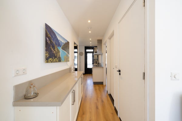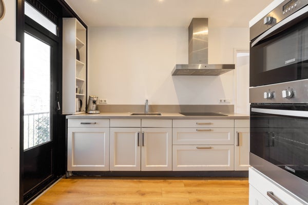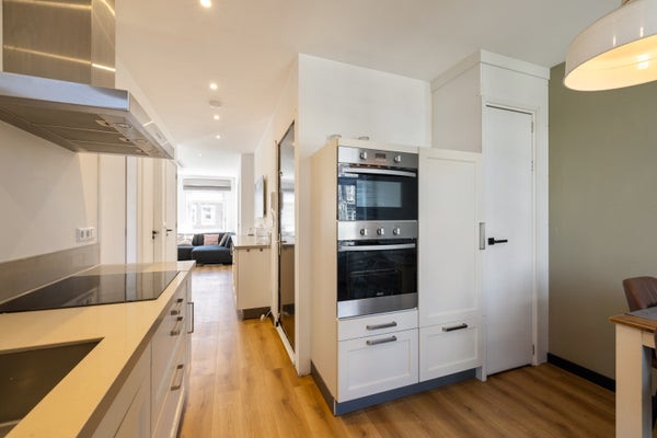 Aan de achterzijde ligt de moderne keuken die volledig is uitgerust met een inductiekookplaat, magnetron, oven, afzuigkap, vaatwasser en koel vriescombinatie. Vanuit de keuken stapt u zo het balkon op, een heerlijke plek om van de buitenlucht te genieten. De woning beschikt verder over twee slaapkamers, waarvan één met toegang tot het balkon en uitzicht op de binnentuinen. De tweede slaapkamer ligt aan de voorzijde en ontvangt veel daglicht. De badkamer is stijlvol uitgevoerd met een inloopdouche, moderne wastafel en hoogwaardige afwerking. Daarnaast is er een separaat toilet aanwezig.