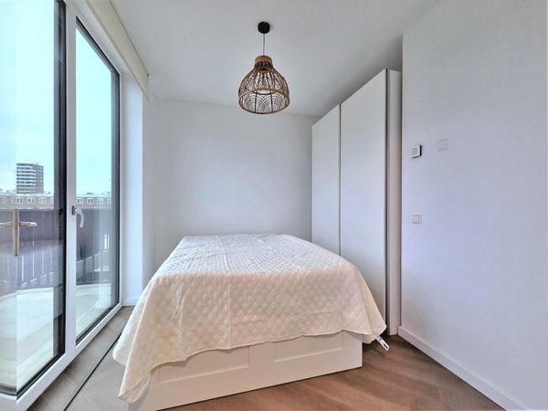 Het appartement beschikt over twee royale slaapkamers tegenover elkaar, waarvan één met tweepersoonsbed en ruime kasten. In de gang bevindt zich een apart toilet. De badkamer is voorzien van een inloopdouche en een stijlvol wastafelmeubel.