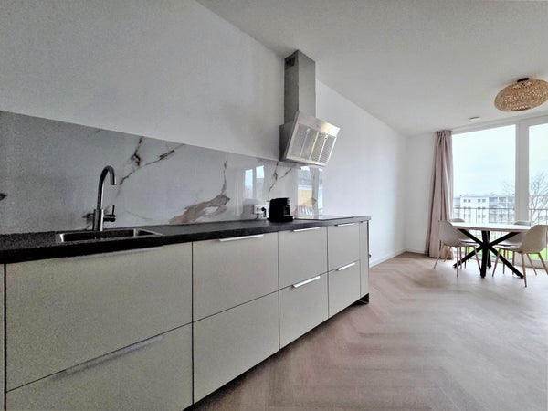 De lichte woonkamer aan de voorzijde strekt zich over de volledige breedte van het appartement en sluit aan op een ruime, smaakvolle open keuken. Deze is uitgerust met moderne inbouwapparatuur, waaronder een inductiekookplaat met afzuiging, koel-vriescombinatie, vaatwasser en oven, en biedt voldoende kastruimte. In een aparte kast zijn de wasmachine en WTW-unit geplaatst. Het gehele appartement is voorzien van een fraaie PVC-vloer met vloerverwarming.