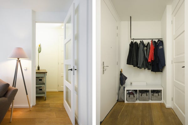 Entree in de gemeenschappelijke hal. Lift naar de 2e. Korte wandeling naar het appartement. Entree in hal met deuren naar opslag, 2e toilet en woonkamer. De woonkamer heeft veel ruimte voor een eettafel (vooraan) en een zithoek in het midden. De volledig uitgeruste keuken is open en heeft een bar. Alle moderne gemakken zijn aanwezig.