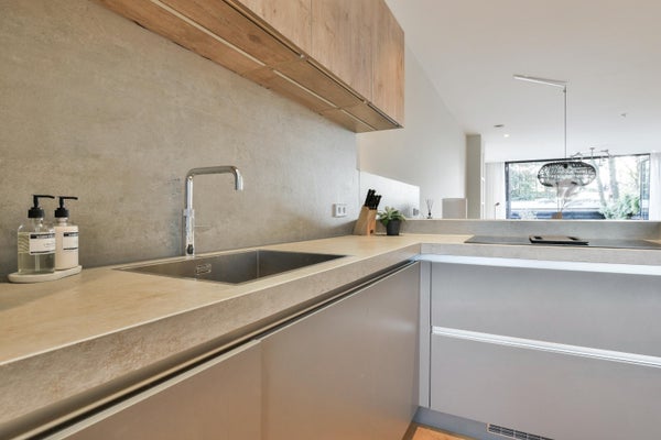De ruime, verlengde lichte woonkamer met zicht op de tuin heeft grote ramen die helemaal open kunnen schuiven, waardoor een binnen/buiten gevoel in de woonkamer ontstaat. Ideaal op zonnige dagen en wanneer vrienden op bezoek komen voor een BBQ en drankjes.