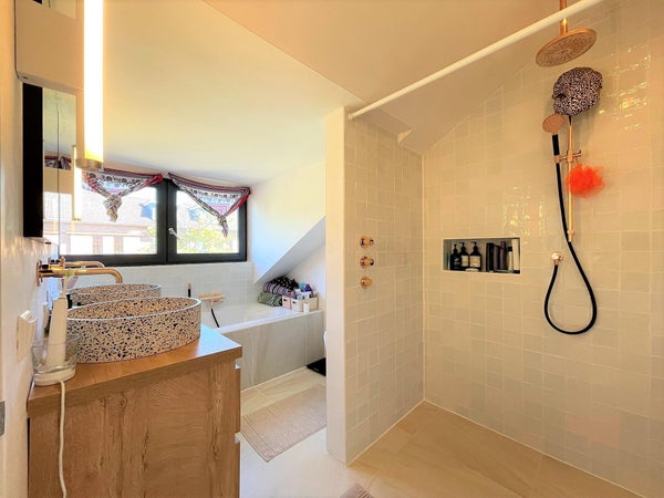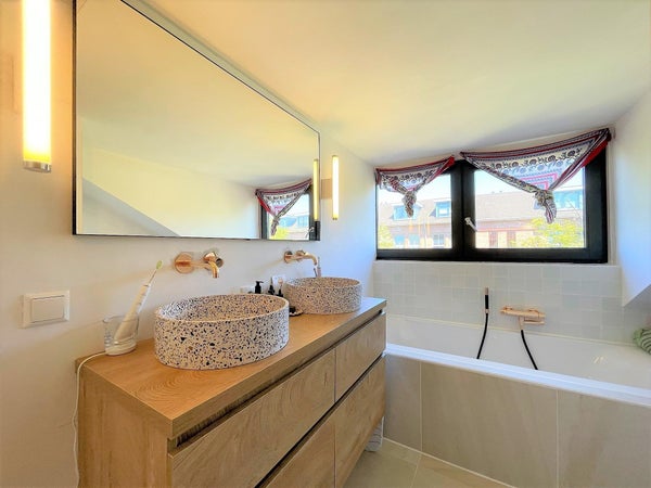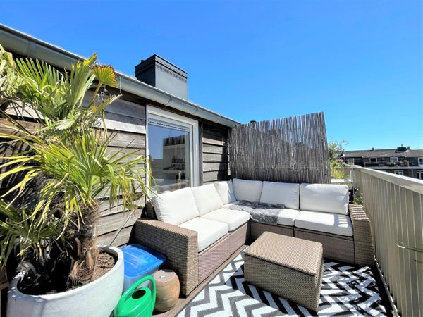 Indeling: Centrale entree met trap naar de tweede verdieping. Overloop met toegang tot de woonkamer aan de voorzijde en een semi-open keuken aan de achterzijde. De moderne keuken is voorzien van diverse apparatuur waaronder een gasfornuis met afzuigkap, vaatwasser, combi-oven, koelkast en vriezer. Vanuit de keuken is er toegang tot het balkon met zicht op de fraai aangelegde binnentuin. De eerste slaapkamer is op deze verdieping gelegen en heeft ook toegang tot het balkon middels een dubbele deur. Separaat toilet met fonteintje bereikbaar vanaf de overloop. Middels een interne trap is er toegang tot de bovenste verdieping waar de master bedroom is gelegen die toegang biedt tot een heerlijk groot dakterras. Zowel het balkon als het dakterras zijn gelegen op het zonnige zuidwesten! Verder op deze etage een volledig gerenoveerde luxe badkamer met grote inloopdouche, dubbele wastafel, een ligbad en een tweede toilet. Een derde kleine slaapkamer biedt plaats voor de was-/droogcombinatie. Op de begane grond is de prachtige gemeenschappelijke tuin te bereiken.