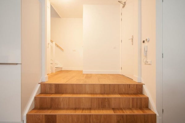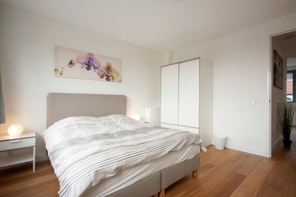 De royale en lichte woonkamer vormt het hart van het appartement en staat in open verbinding met de moderne keuken. Dankzij de grote raampartijen geniet de woning van veel natuurlijk licht.