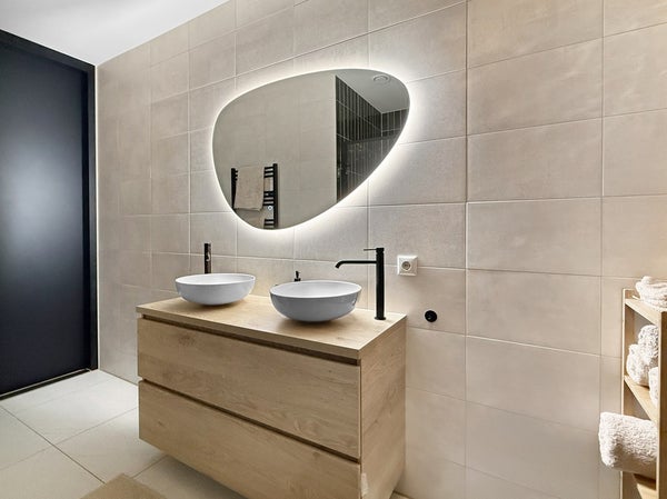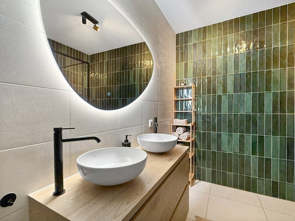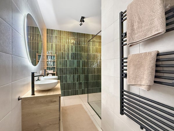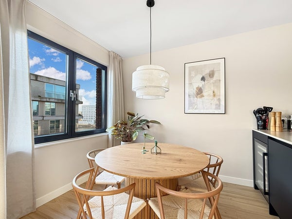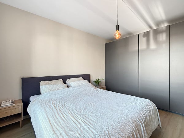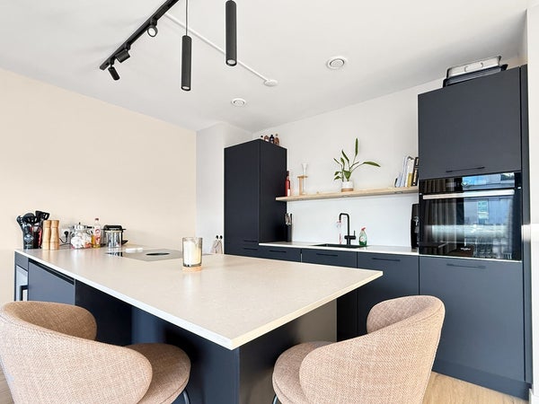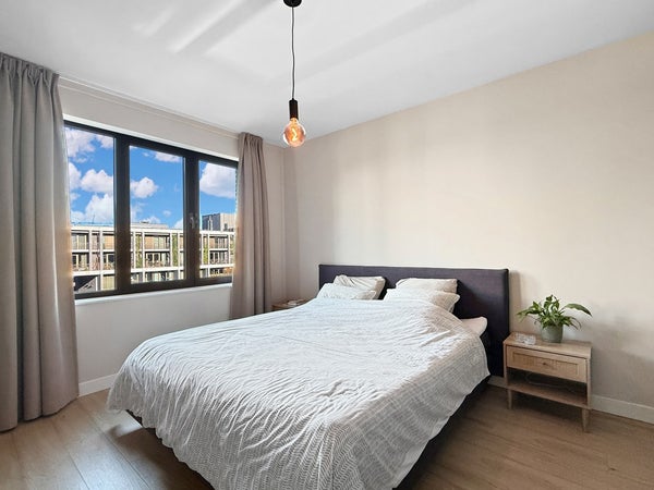 Het appartement beschikt over twee goed bemeten slaapkamers, ideaal als master bedroom en werkkamer/logeerkamer. De luxe badkamer is uitgerust met een ruime inloopdouche, dubbele wastafel en modern sanitair.