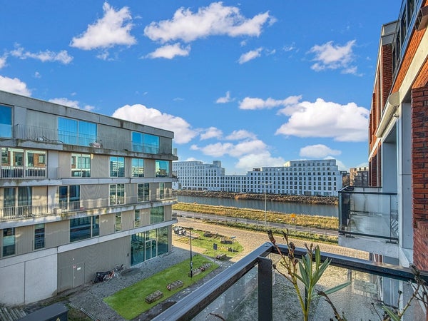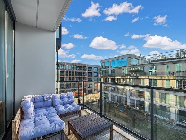 Het ruime balkon biedt een heerlijke plek om te ontspannen met uitzicht op de moderne architectuur van de omgeving.
