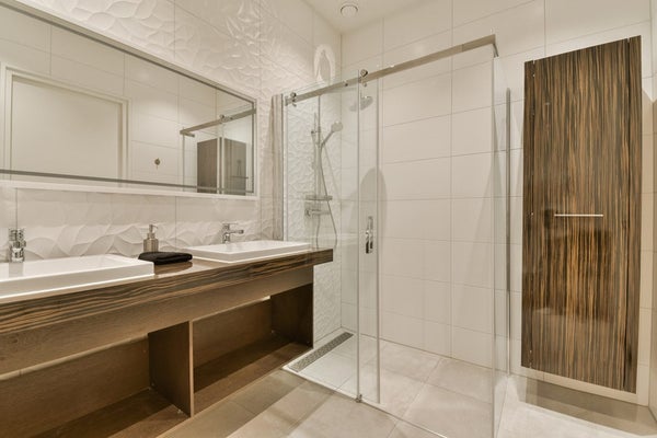 Badkamer met wand-toilet, dubbele design wastafel en inloopdouche