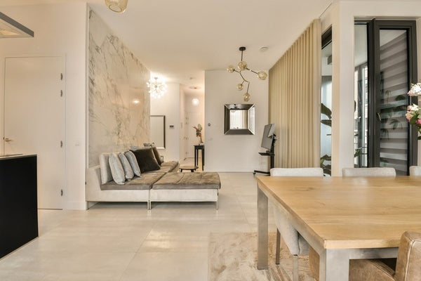 Ruime, lichtovergoten woonkamer met elegante vloeren en grote ramen