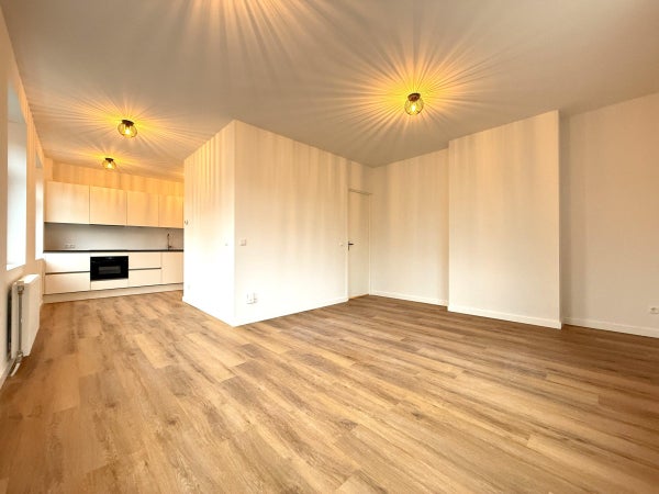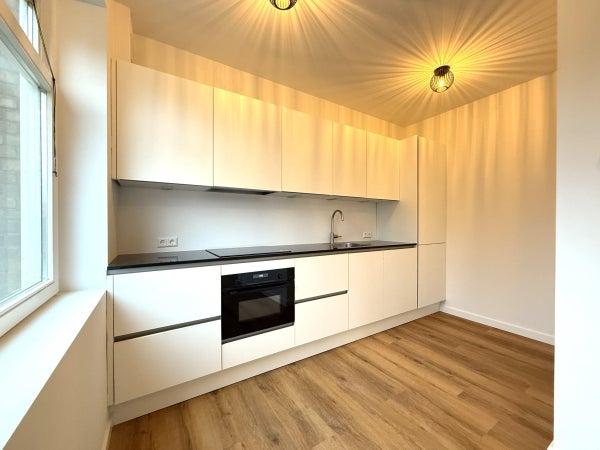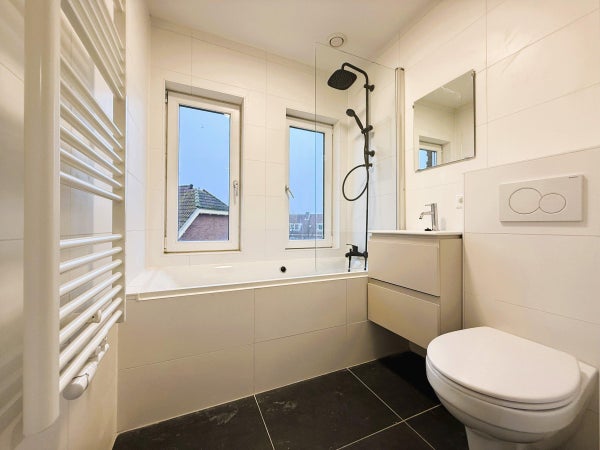 Indeling: Privé entree aan de achterzijde van het pand, op de begane grond. Trap naar de eerste etage. Hal die toegang biedt tot de ruime en lichte woonkamer met moderne semi-open keuken. De keuken is voorzien van een koelkast, vriezer, combi-oven/magnetron, vaatwasser en inductiekookplaat met afzuigkap. Op deze etage vind je tevens een separate toiletruimte. Vanuit de hal trap naar boven waar de zeer grote ouderslaapkamer te vinden is en een kleinere tweede slaapkamer. Moderne badkamer met douche/bad, wastafel, tweede toilet en designradiator. Er is een aparte ruimte aanwezig voor het plaatsen van een wasmachine en droger. Het gehele appartement is voorzien van een fraaie en lichte PVC vloer en raambekleding.