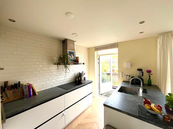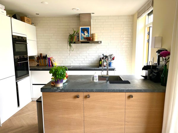 Binnen ervaar je direct de warme uitstraling van de houten visgraatvloer en het gevoel van ruimte dankzij de grote raampartijen. De moderne open keuken met hoogwaardige inbouwapparatuur vormt het hart van de woning – ideaal voor wie houdt van koken en gezelligheid. De keuken is voorzien van een (inbouw)vaatwasser, twee inbouwovens en een inductiekookplaat. De lichte woonkamer biedt toegang tot een heerlijk balkon, waar je even kunt ontsnappen aan de dynamiek van de stad.