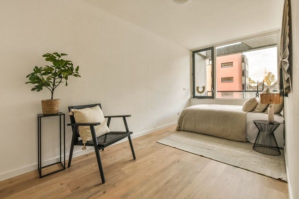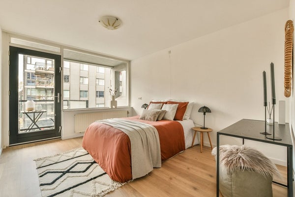 • De hoofdslaapkamer is licht en goed proportioneel, met een groot raam en directe toegang tot het achterste terras met uitzicht op de gracht.