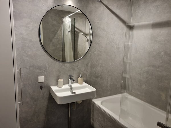 De badkamer is modern en heeft een bad met douche, wastafel en opbergruimte.