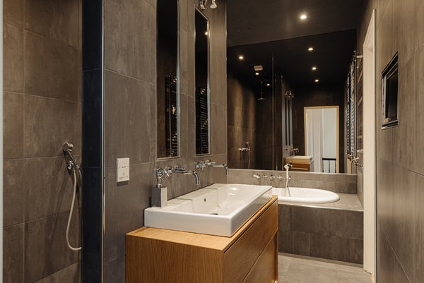 Zowel vanuit de master bedroom, als vanuit de hal is er toegang tot de luxe badkamer met inloop regendouche, bad met televisie en dubbele wastafel.