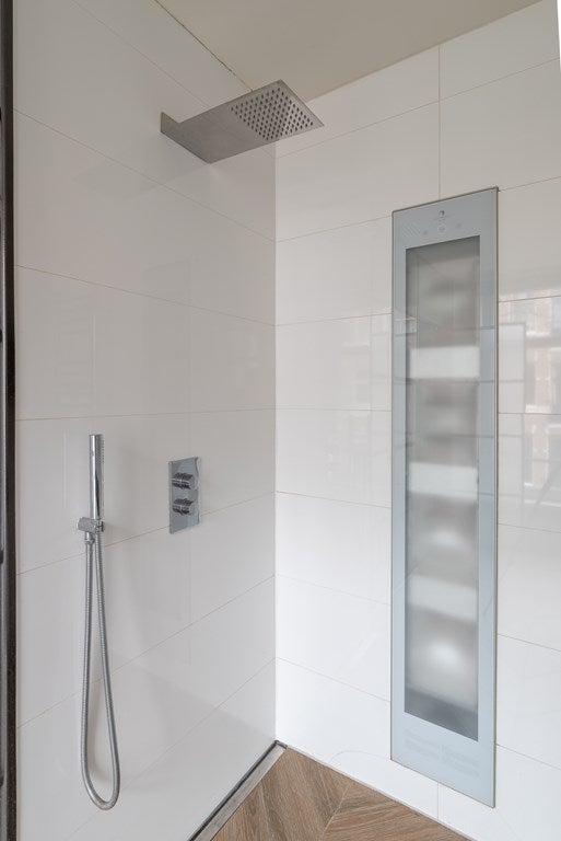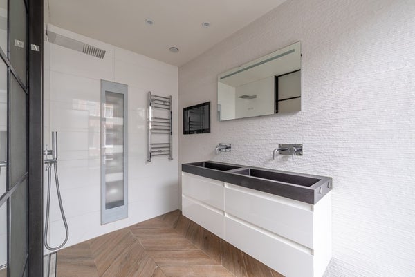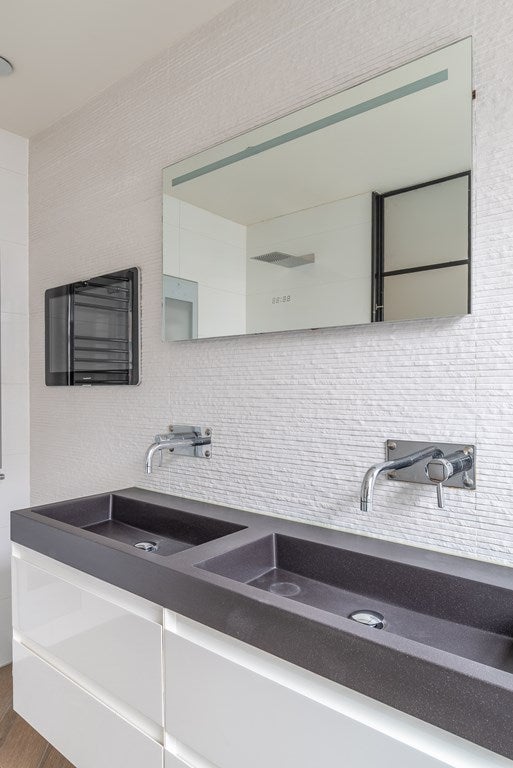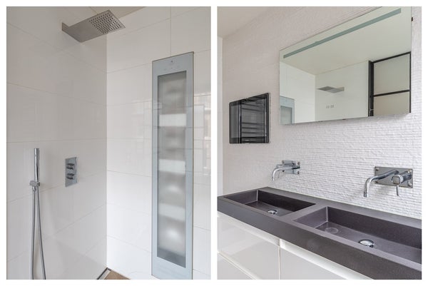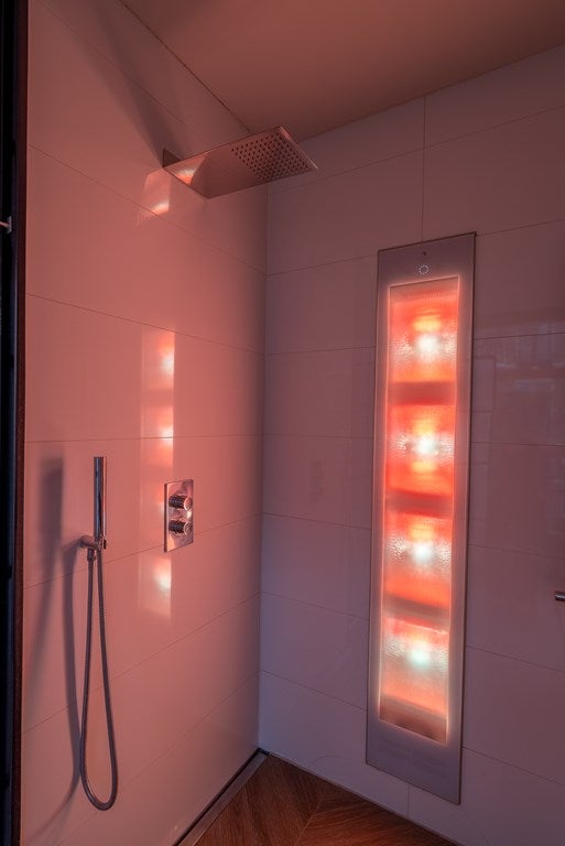 De luxe badkamer bevindt zich naast de slaapkamer. De badkamer is voorzien van een inloopdouche, infrarood zonneshower, televisie, grote wastafel en vloerverwarming.