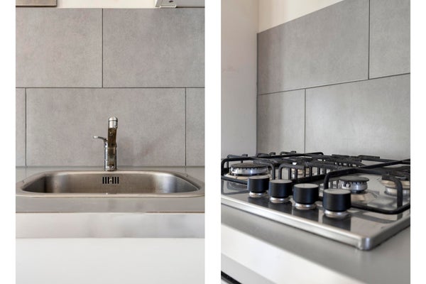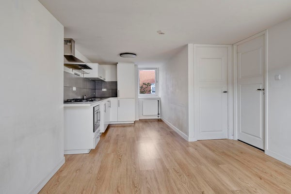 Via de gedeelde entree bereik je met de trap de vierde verdieping. Hier kom je binnen in de lichte woonkamer met open keuken. Dankzij de grote raampartijen geniet je van veel daglicht en een prettig ruimtelijk gevoel. De moderne keuken is uitgerust met inbouwapparatuur, waaronder een koel-vriescombinatie, gaskookplaat, afzuigkap, combimagnetron en vaatwasser. Er is tevens een aansluiting voor een wasmachine aanwezig.